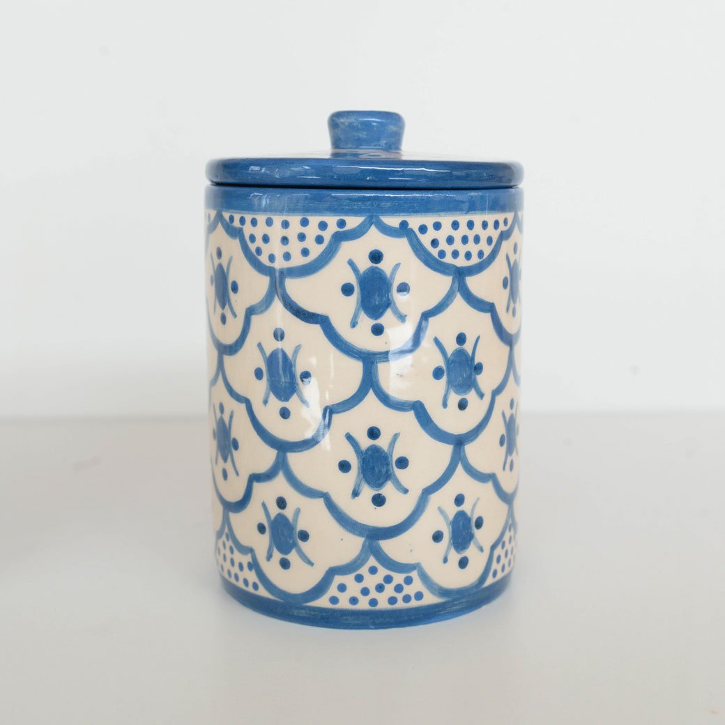 Caja Marrakech Zellig Útil para todas los espacios de tu hogar, para guardar lo que mas te gusta!!! DETALLES Fabricación: hecho y pintado a mano. Patron: estilo marroquí tradicional. Material: cerámica blanca, pintura sin plomo. Dimensiones: H8 D11 CM