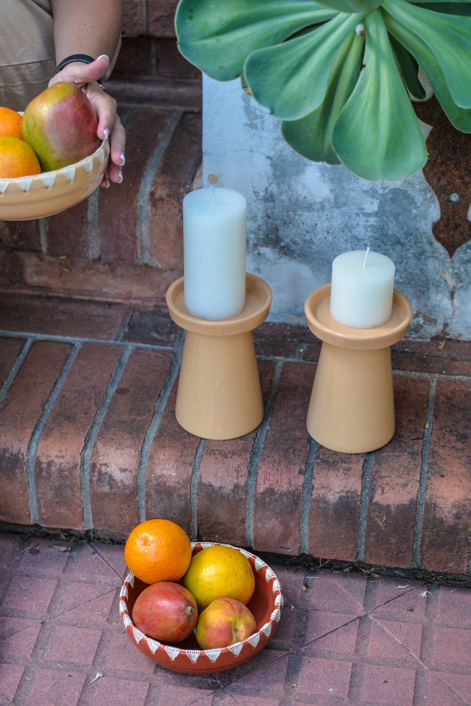 Dúo Candelabros Sahara Estos candelabros de cerámica crean un ambiente íntimo y cálido en tu hogar, invitándote a soñar y relajarte. Su diseño único fusiona tradición marroquí y modernidad, haciéndolos perfectos para cualquier espacio. Son impermeables, por lo que son ideales tanto para interiores como exteriores. Dimensiones: Grande D11 x H16,5 cm , Mediana D10 x H12 cm Material: Cerámica