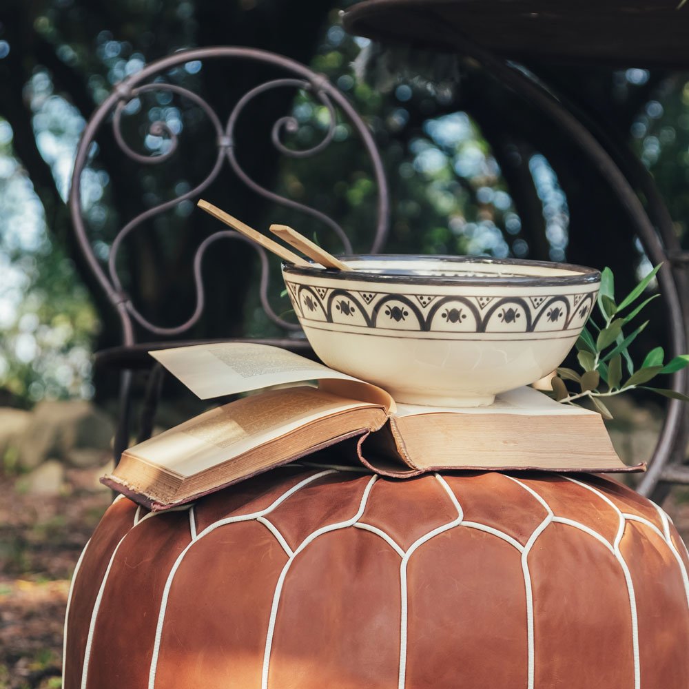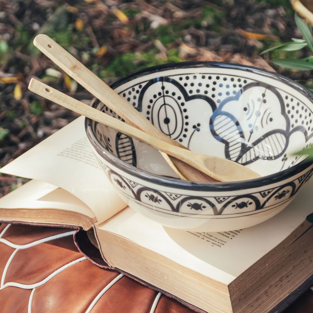 Ensaladera XXL de Cerámica Negro – Colección Fez Ensaladera XXL de cerámica para lucirte en la presentación de tus ensaladas. Las cerámicas Tanit están hechas y pintadas a mano de forma tradicional. DETALLES Fabricación: hecho y pintado a mano. Patron: de estilo marroquí tradicional. Material: cerámica blanca, pintura sin plomo. Dimensiones: GRANDE D28 H12 cm Características: cerámica apta para alimentos y lavavajillas