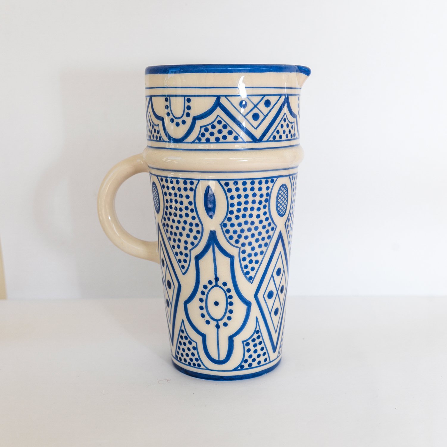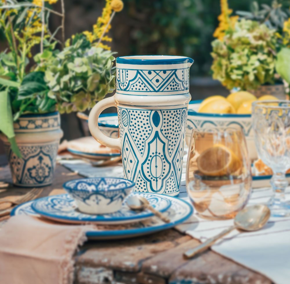 Jarra Tanit Azul Cobalto – Colección Marrakech Útil para todas las ocasiones: para servir agua, jugos de frutas o para disponer de flores, ¡la jarra de Tanit sirve para todo! DETALLES Fabricación: hecho y pintado a mano. Patron: estilo marroquí tradicional. Material: cerámica blanca, pintura sin plomo. Dimensiones: H21 D11 CM . Capacidad 1 litro. Características: cerámica apta para alimentos.