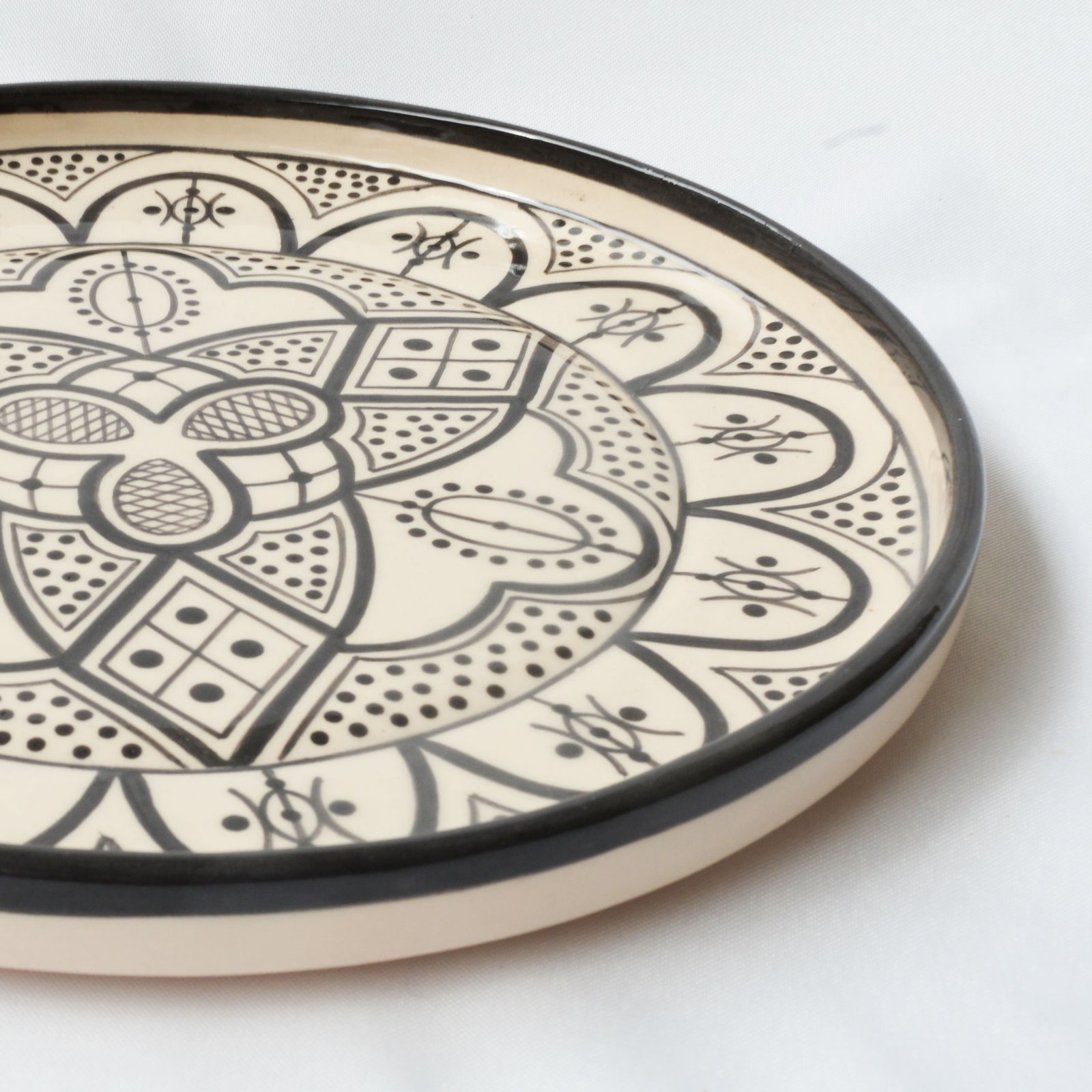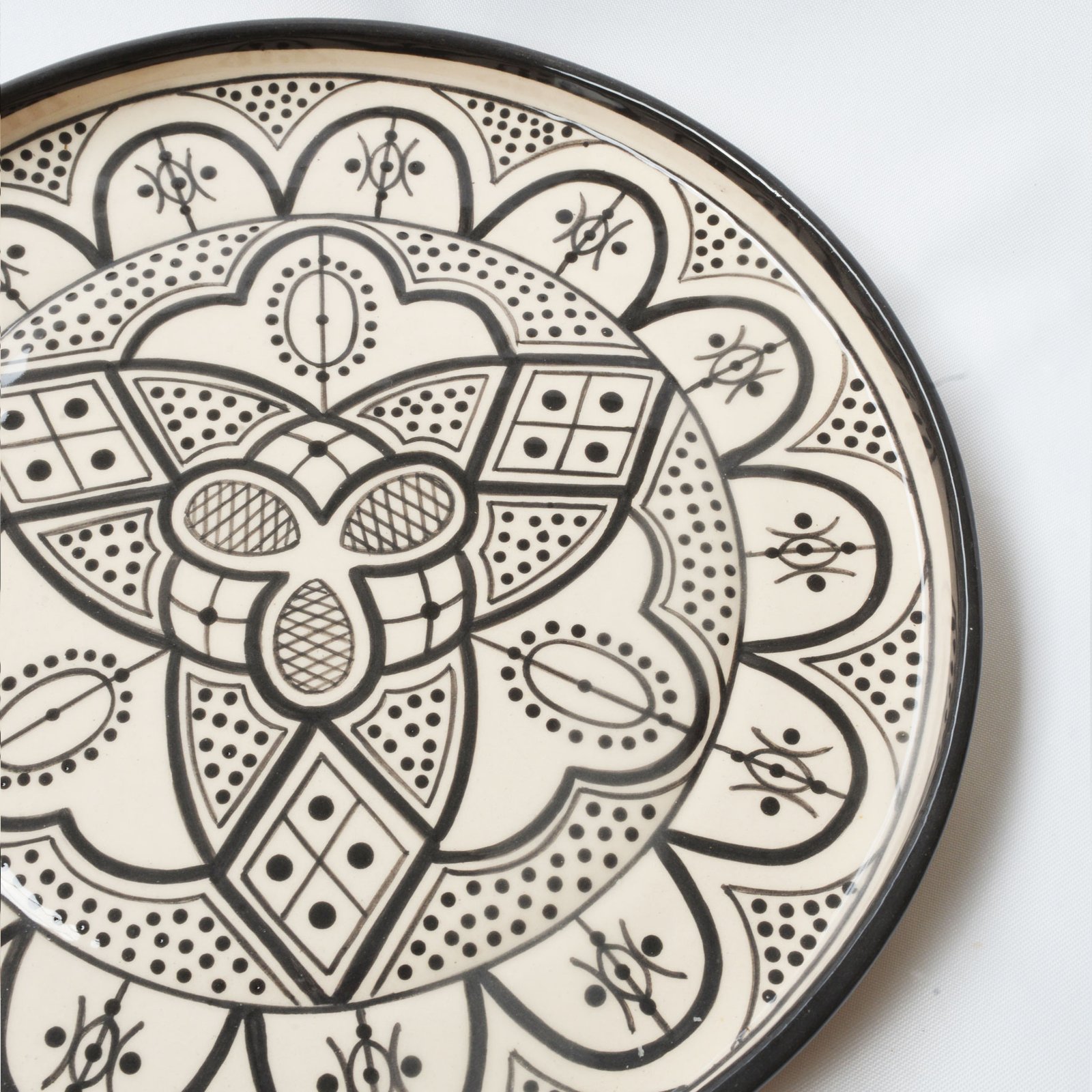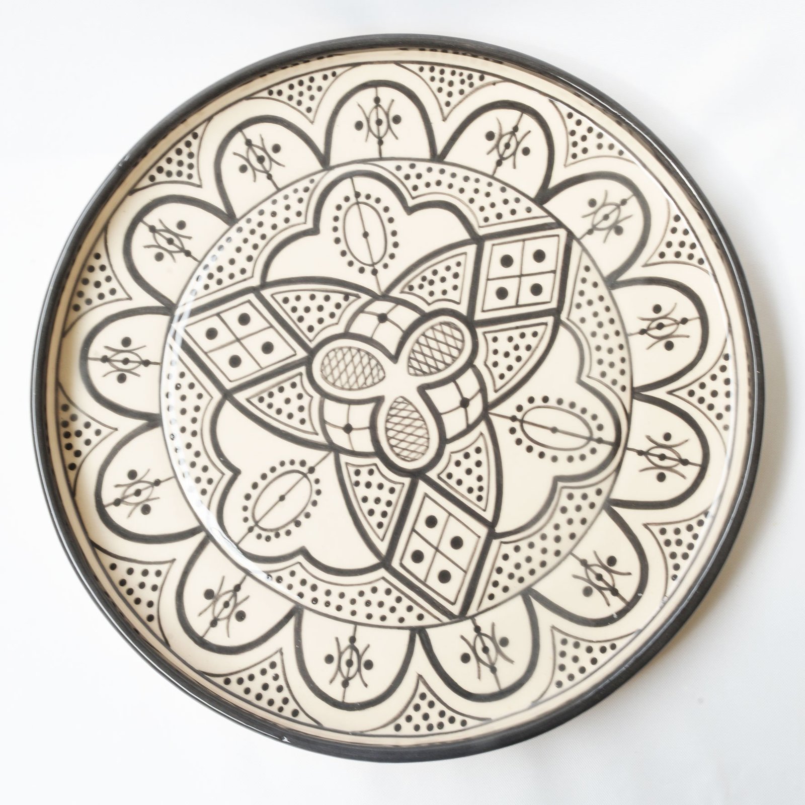 Plato Playo de Cerámica Negro – Colección Fez Plato de cerámica para vestir tu mesa con clase y elegancia. Los platos le dan a tu mesa ese toque distinguido y original que sólo Tanit te puede dar. Las cerámicas Tanit están hechas y pintadas a mano de forma tradicional. DETALLES Fabricación: hecho y pintado a mano. Patron: de estilo marroquí tradicional. Material: cerámica blanca, pintura sin plomo. Dimensiones: D29 cm Características: cerámica apta para alimentos