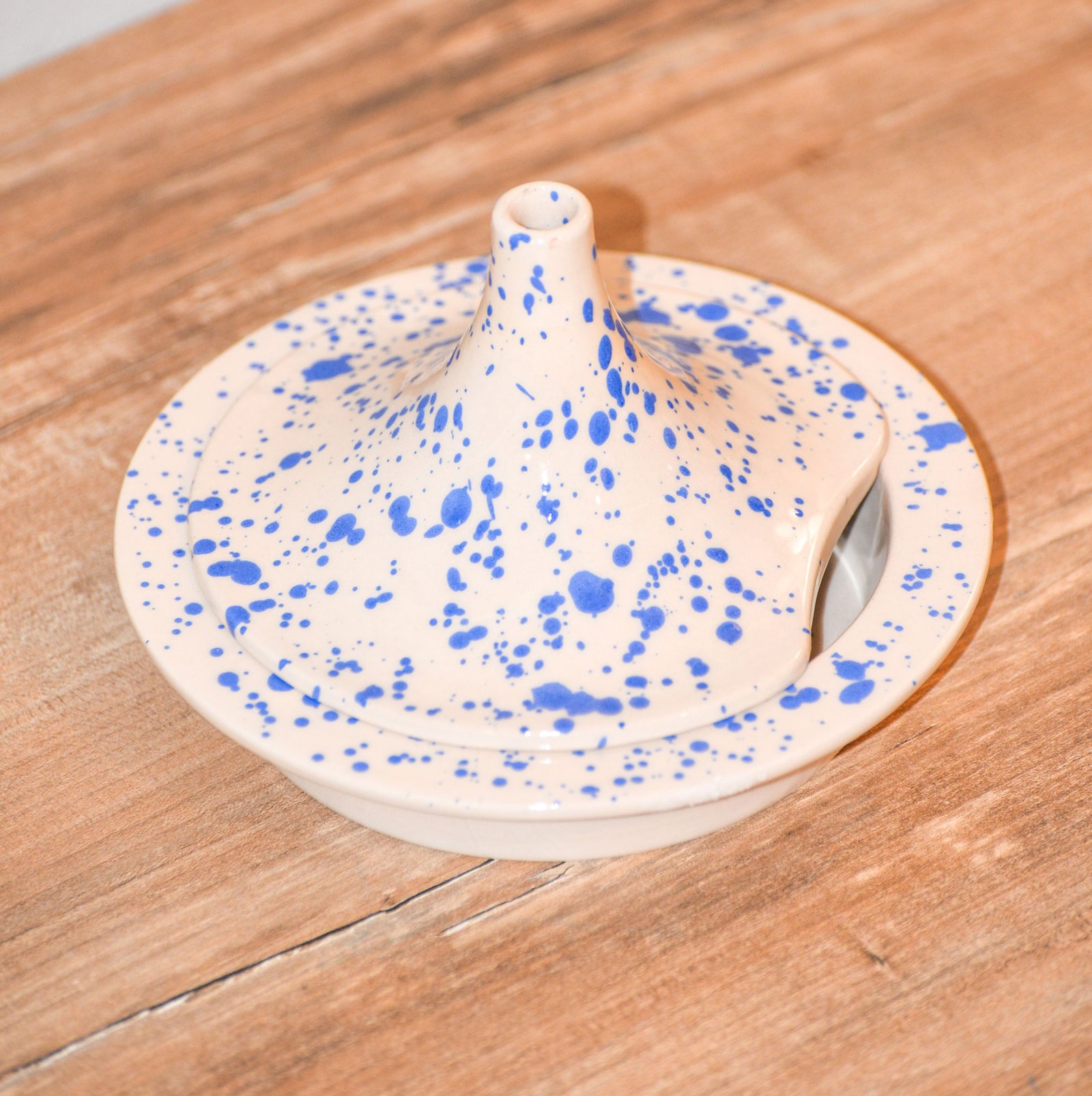 Contenedor Para Espiral de Mosquitos Granito Azul Este elegante contenedor de cerámica, con tapa y parte inferior, es perfecto para sostener espirales de mosquitos. Su diseño funcional y decorativo es ideal para sahumados y limpieza del hogar, tanto en interiores como al aire libre. Medidas: D17 H 12 Cerámica